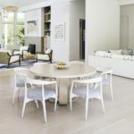 Located in prestigious Hillsborough, California, this stunning residence was recently featured in California Homes. A remarkable transformation brought about by TRG Architects and designer Tineke Triggs, it was fashioned from a dark and outdated Midcentury Modern home to a breathtaking Australian-inspired Modern home with an idyllic beachy allure. Its open floor plan bathed in natural light was achieved with a variety of whites, along with neutral palettes and light woods making our Aquila White Oak flooring with its vanilla hues and warm undertones, the ideal floor for recreating the tranquil vibe the homeowners had envisioned. This blend of white décor and wide plank floors with beautiful color variation, culminates into an inviting oasis where serenity and luxury merge.